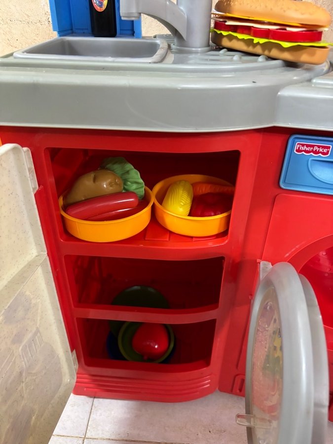 مطبخ بلاستيك قوي ماركة fisher price ( ارتفاع ٨٦ سم ، عرض ٦٥ سم ، عمق ٣٠ سم )