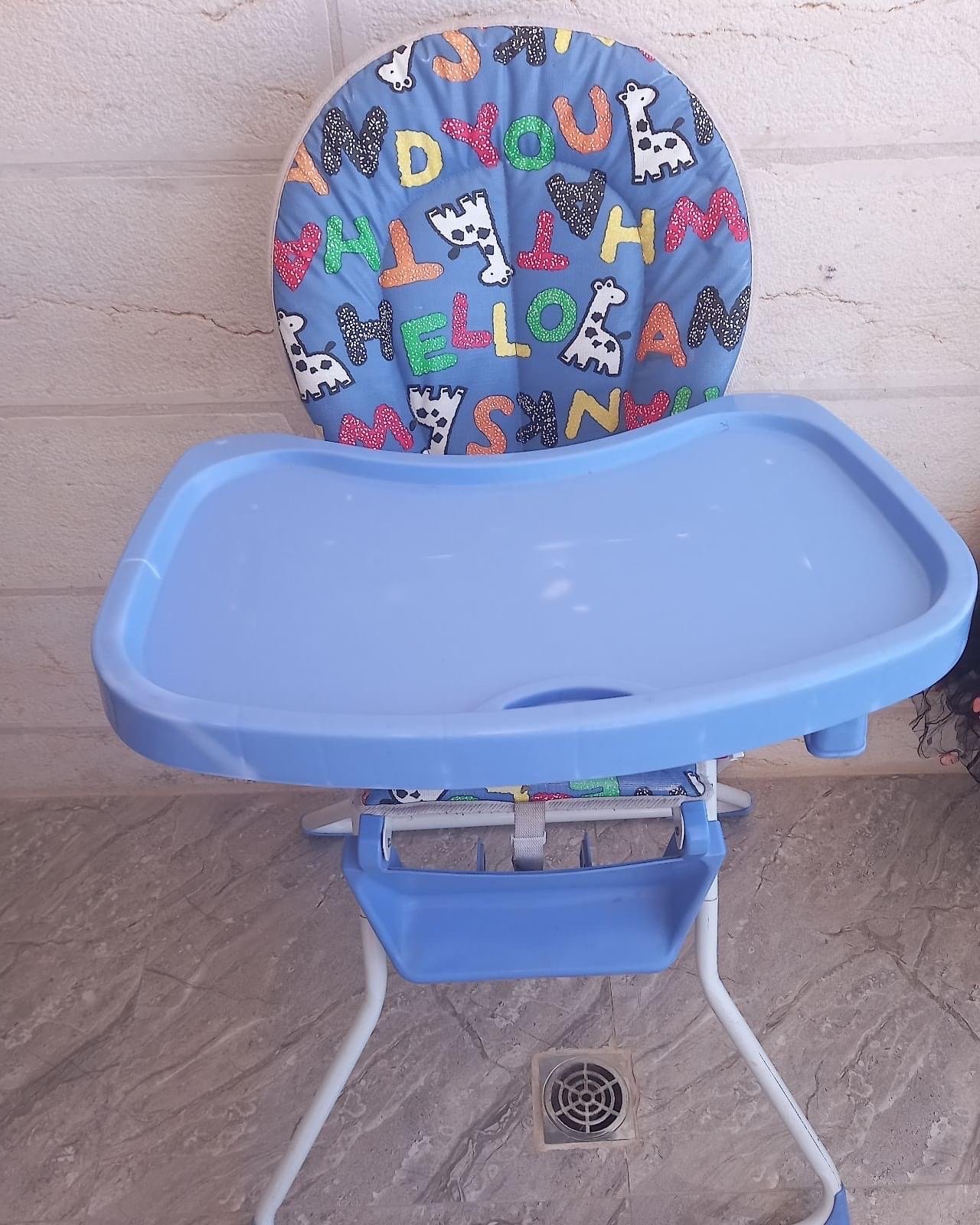 كرسي أكل للأطفال بلون أزرق مميز يمكن إزالة القطعة الأمامية حالته جيدة جداً ومعقم..