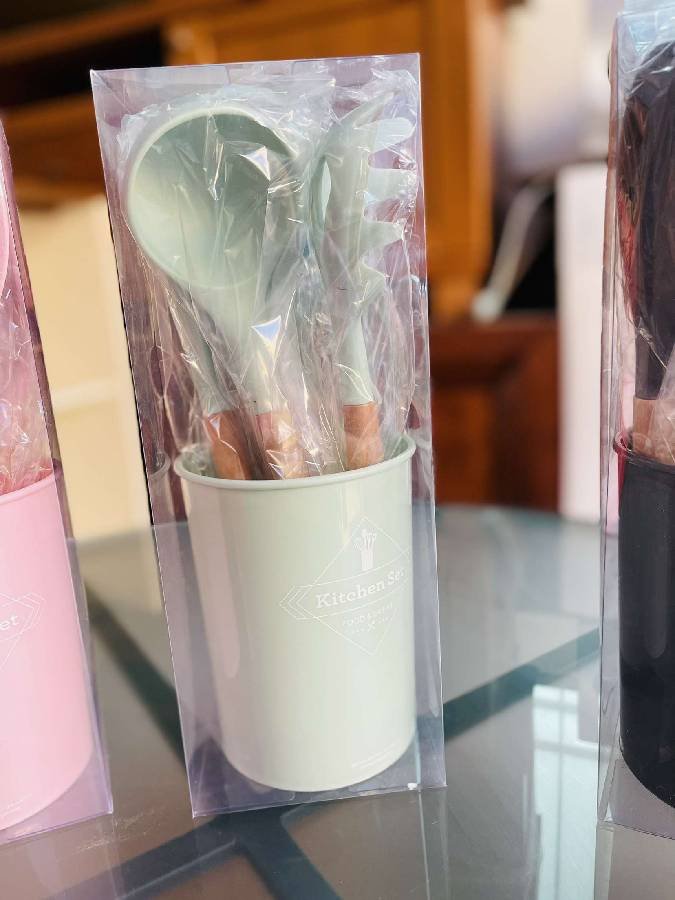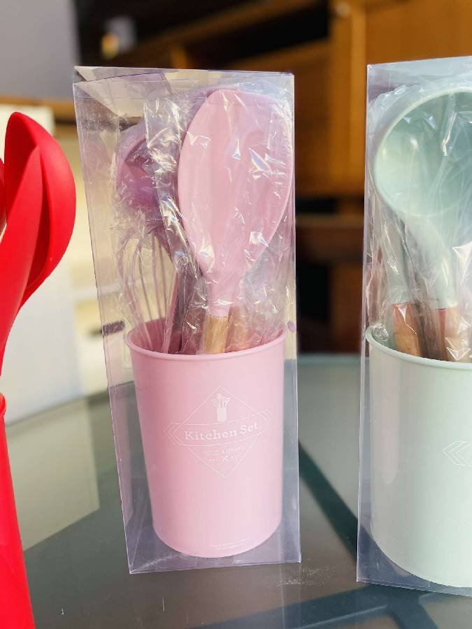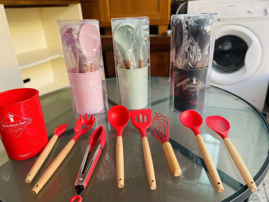8 قطع مختلفة من أساسيات المطبخ سيليكون حراري يد خشب