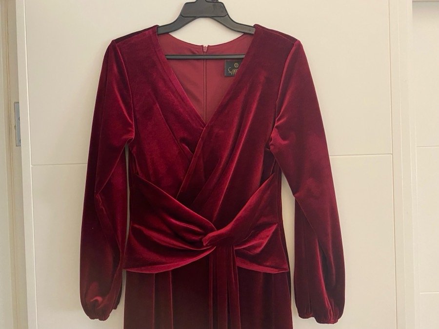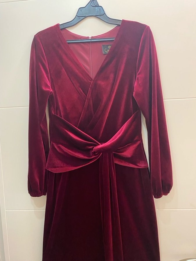 فستان طويل خمري اللون قماشة مخمل بلبس حجم ٤٠/٣٨