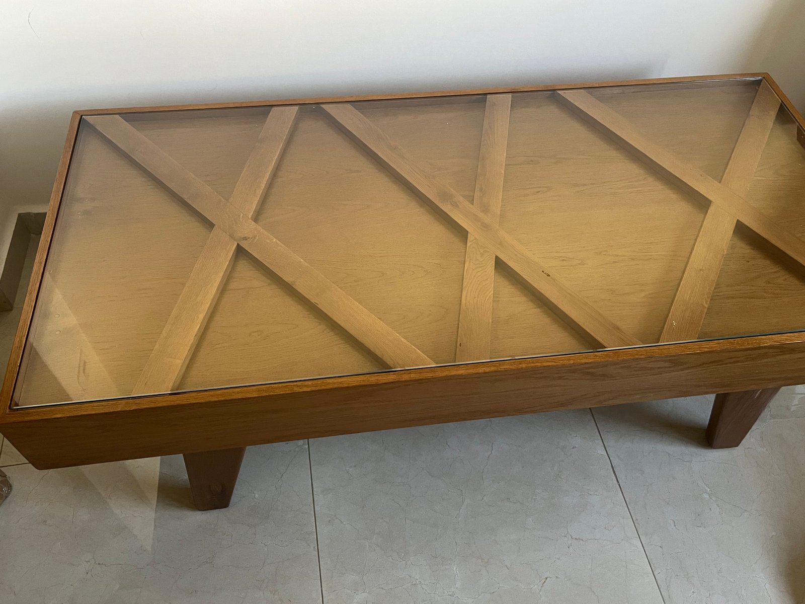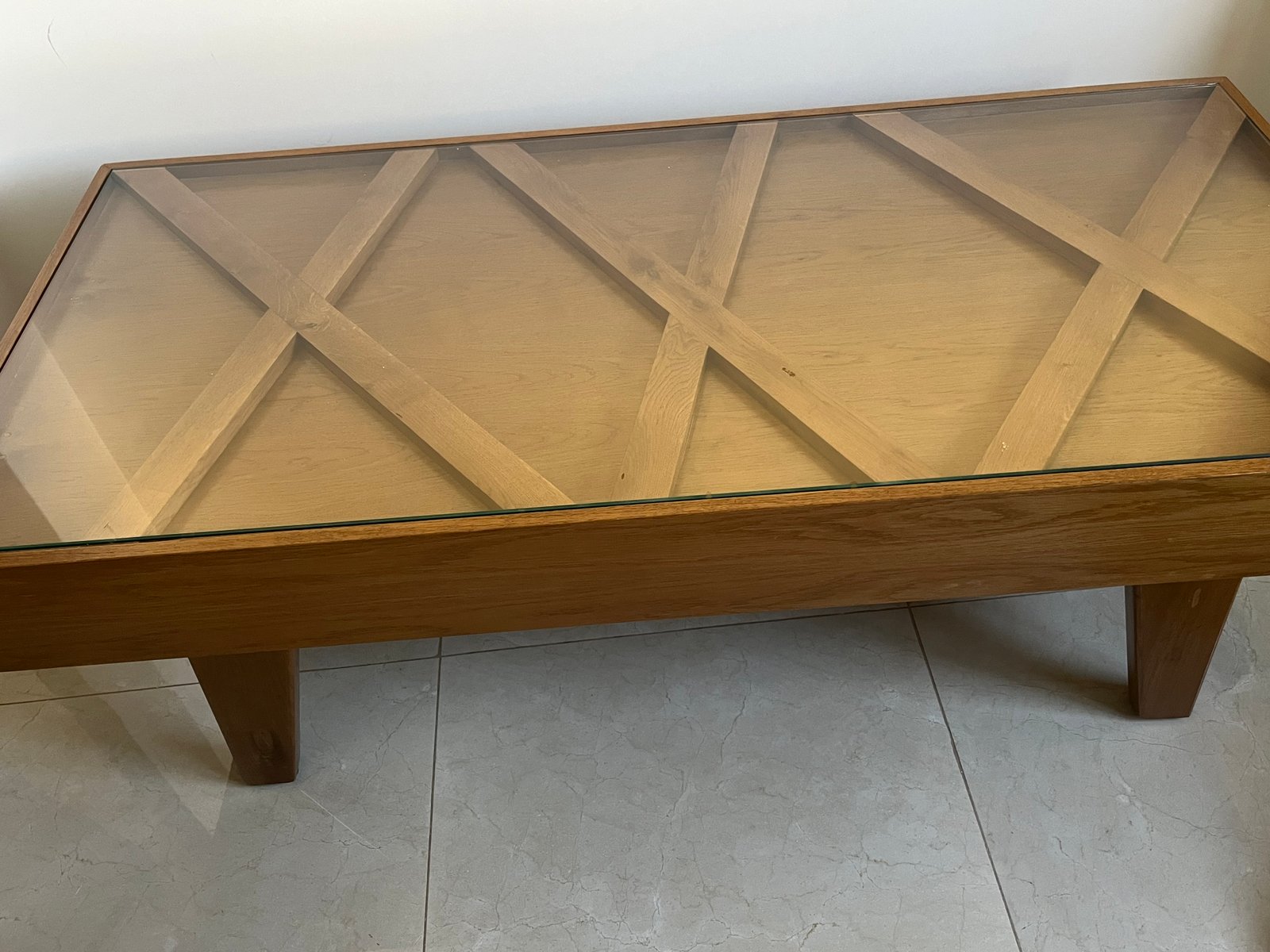 طاولة وسط مستعملة بحالة ممتازة خشب ثقيل وفوقها قطعة زجاج ثقيلة