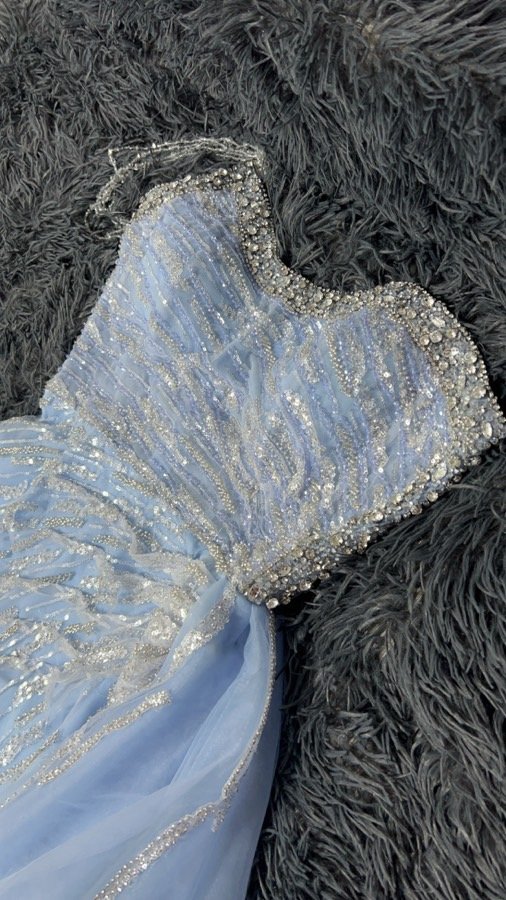 فستان مناسبات ثقيل وراقي لون ازرق سماوي لبسة وحدة شبه جديد مناسب لنمرة 38-42