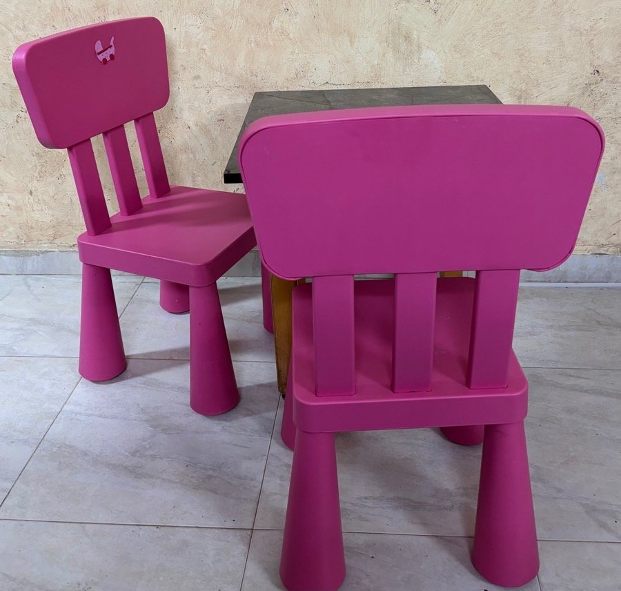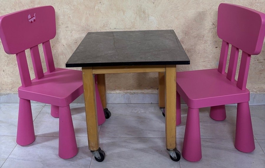 طاوله خشب عليها عجال مع كرسيين بلاستيك قوي ماركة ikea