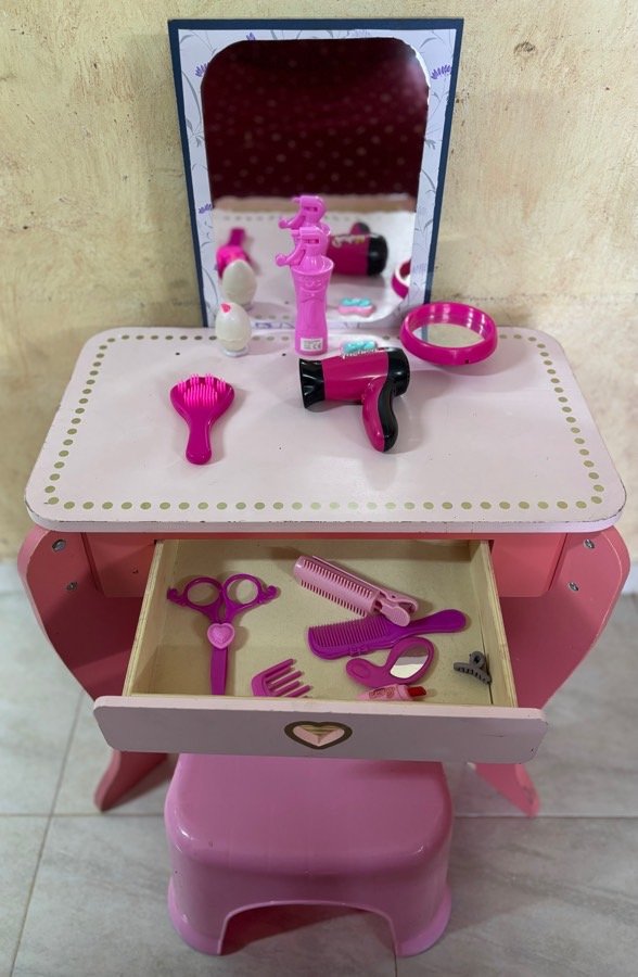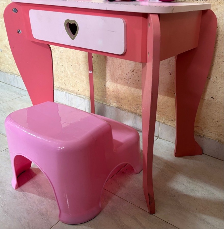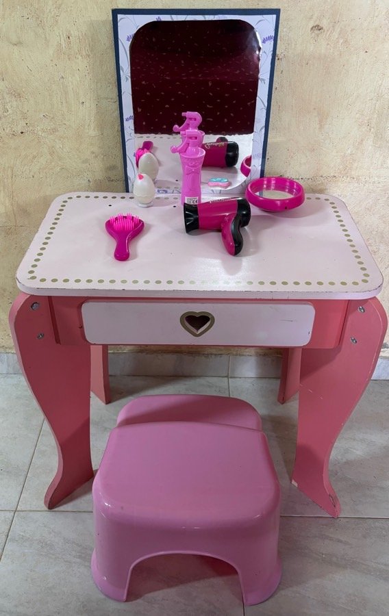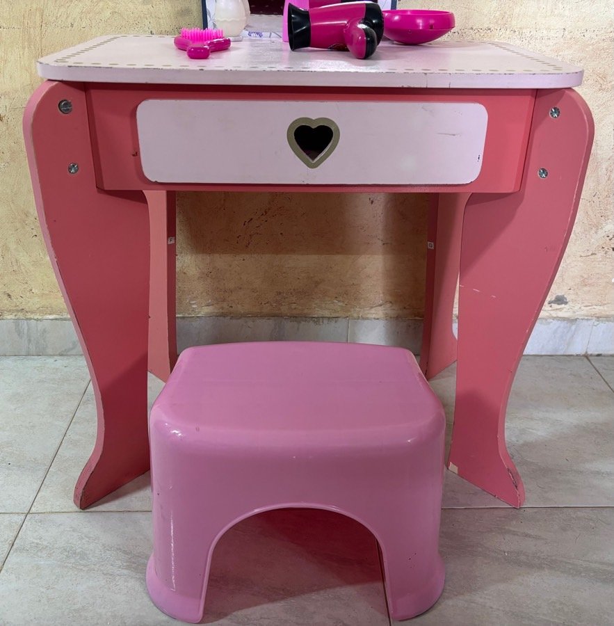 مراية زينه من خشب ( عرضها ٥٠ سم ، ارتفاعها ٧٦ سم ، عمقها ٣٣ سم ) معها كرسي بلاستيك والعاب زينه ب ٦٥ شيكل