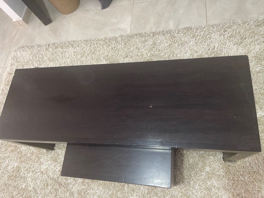 يوجد فيه خدوش خشب زان بني غامق على اسود ثقيل يوجد ادرج عدد٥ بطاولة التلفزيون ديكور مرتب