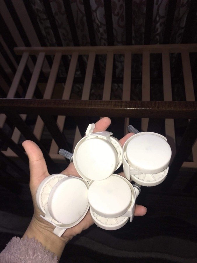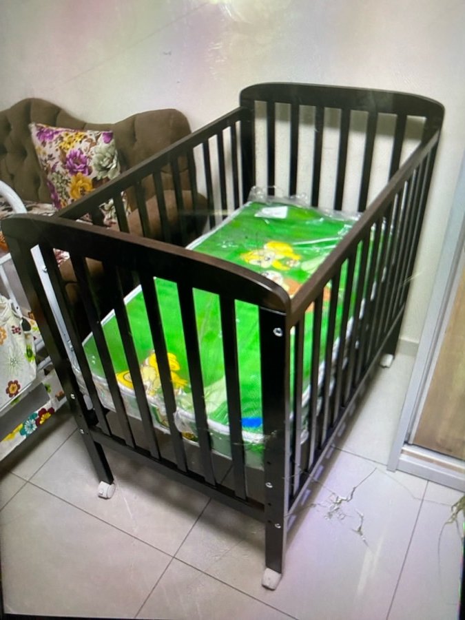 تخت بيبي خشب لون بني مع فرشة و عجال مع كوته اطفال للسيار هدية